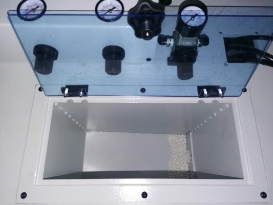 ![]() | Automatsko pneumatsko punjenje granuliranog lepka. Donji levak 12,5 kg transportuje granule vazdušnim tokom do gornjeg levka sa prethodno rastopljenim lepakom. |