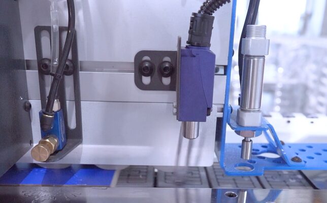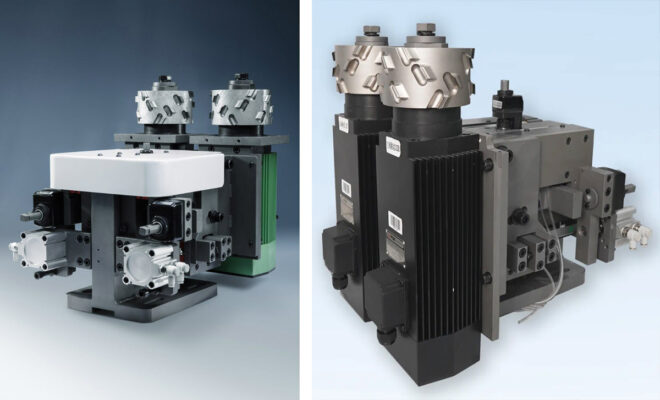 ![]() | Pritisna jedinica se sastoji od 4 valjka pokretana pneumatikom, što garantuje ravnomernu raspodelu sile. Dva valjka su konusna za distribuciju sile preko debljine obratka, a dva cilindrična primenjuju pritisak po celom delu. Predrezni nož ima snažan pneumatski cilindar, a pritisna jedinica ima servo pogon za precizno pozicioniranje. |