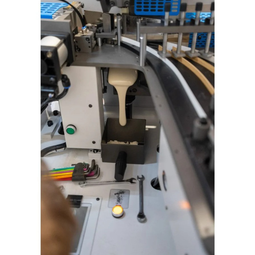 Jednostavnu upotrebu EVA i PUR ljepila omogućava vrlo napredan lončić za ljepilo i automatska izmjena ljepila sa dodatnom komorom za skladištenje, održavanje i predgrijavanje. Bez gubitka vremena (2–3 minute) pri zamjeni ljepila, uz upotrebu svježih i kvalitetnih ljepila.